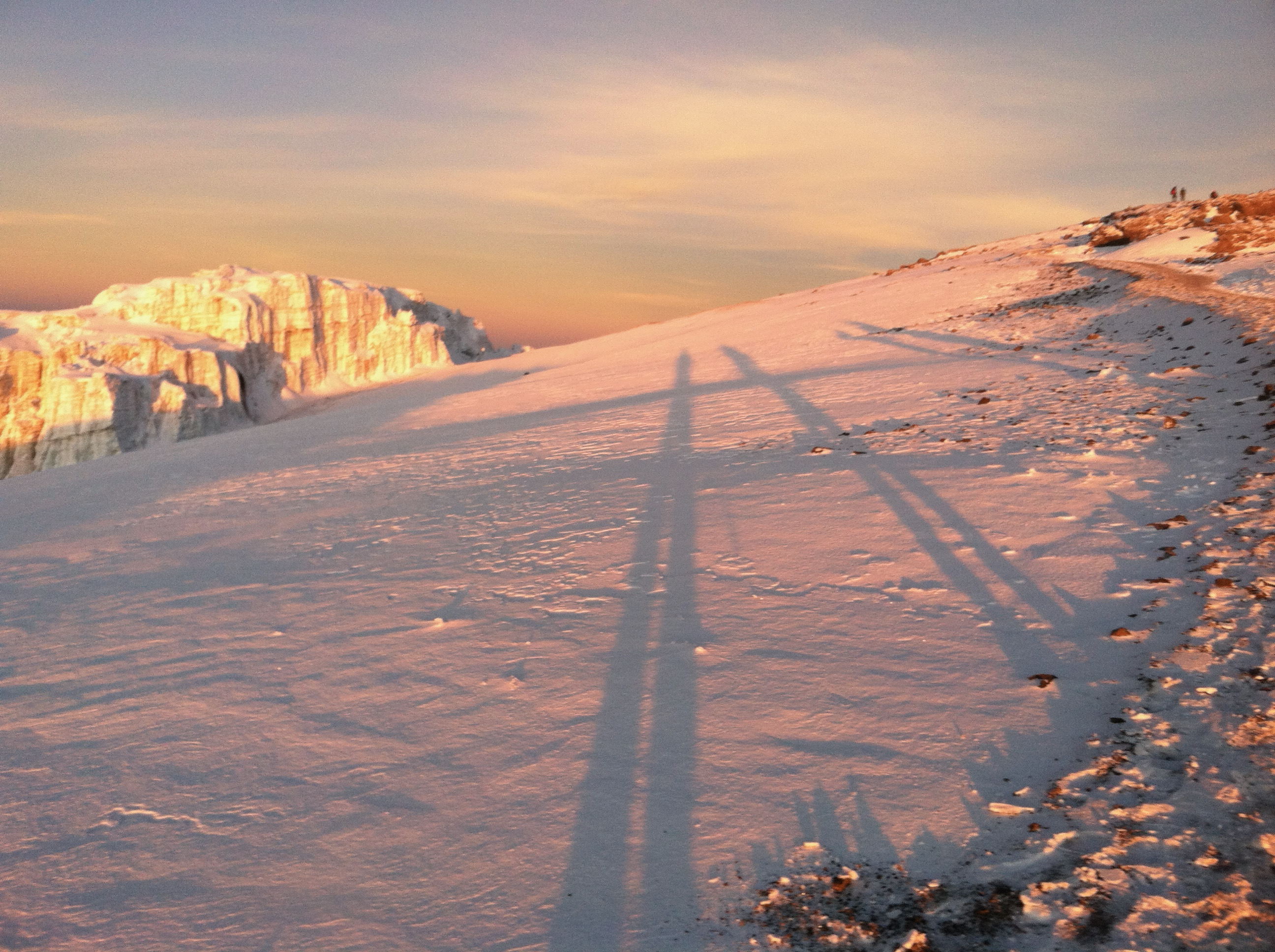 With only an eighth of a mile remaining, it seemed that we were nearly there. But in the thrashing wind and thin air, it took over thirty minutes. Many in my group found these last steps to be the hardest. I didn’t mind taking it slow, though, because the views were spectacular. After hours of blackness, I couldn’t fill my eyes enough with the incredible views. Weird patterns of upside-down icicles formed by melting snow framed the glacier in the background. In the distance, the clouds below looked like an endless frothy ocean below us. We cast impossibly long shadows in the early morning sun. We congratulated a stream of hikers returning from the summit and they encouraged us on. Finally, in a burst of joy, I broke out running the last stretch. It was harder than it looked and I arrived at a weak trot, but I made it. I made it, I made it, I made it.