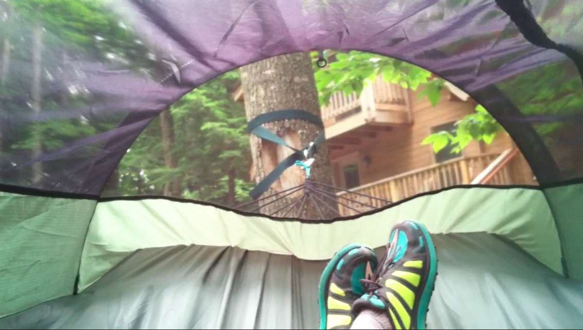 My first night camping! My tent is pitched (hung) and my little stove is fired up, cooking a meal of ramen noodles and sardines. I am proud and happy.