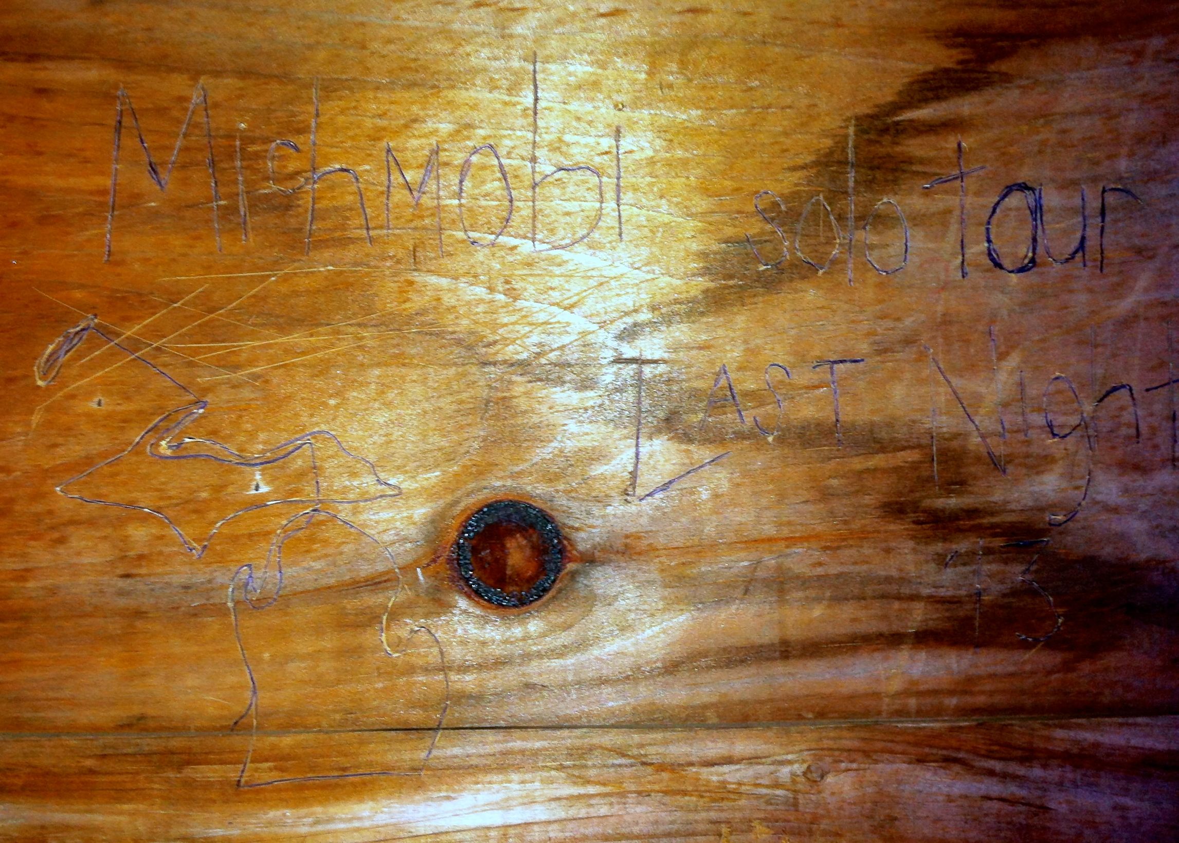 The shelter has an assortment of etchings on the wall. There are couple’s initials names and dates, special quotes. Here is my favorite: