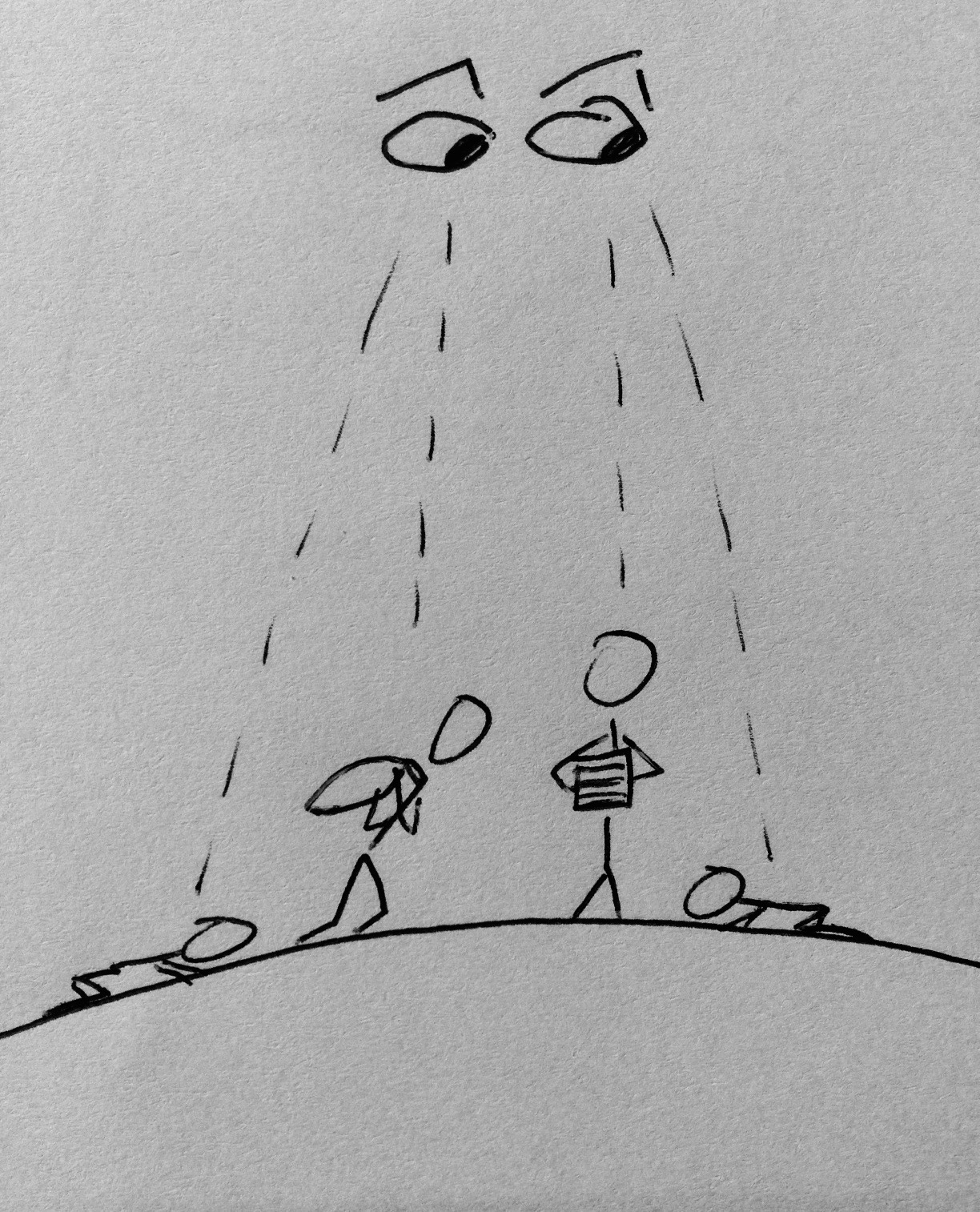 It turned then to watch how, on the side of the lazy god, the people regained their color, they unclenched their minds, they smiled and stretched. It saw too how they stared at each other with expressions of constant bewilderment, each moment was a question that never received an answer. As the initial relief faded, the followers began to feel a sense of emptiness and loneliness. What to do? What good was this life if there was nothing to strive for? Nothing to gain? The followers wallowed in malaise, living in a state of physical and mental filth. In time, many defected back to join the strained people of the strict god. The pinched and confused expressions on the faces of the religious refugees haunted the mind of the third humble god.