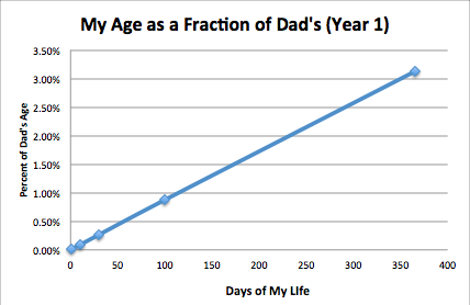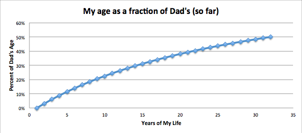 My dad has had an aversion to his birthday since he turned 46 and therefore reached 100% of his dad’s oldest age. I never met Grandpa Obie, who died suddenly of a heart attack well before I was born. I remember asking Dad what he wanted for his 60th birthday and he said “just to live that long.” Today, I’m half dad’s age, and according to my nifty graphs, we would both have to live another 60 years for me to reach 75% of his age, another 2,006 years to get to 99%, and never, not in a forever of living, could I fully catch up.