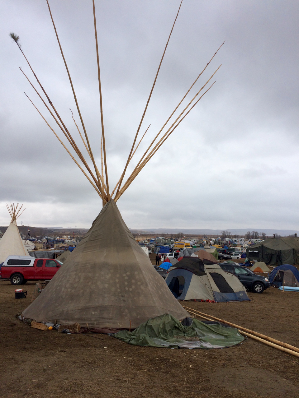 Oceti Sakowin camp splayed out in a valley along a winding river and onto a few rolling hills filled with tepees and tents and cars and flags and people. It was geographically disorienting but there were prominent visual markers including a white dome, the Sacred Fire, flag road, and the road, blocked off, which marked pipeline territory. It was also socially disorienting; it was hard to be sure what my role would be and where I would fit into this place.