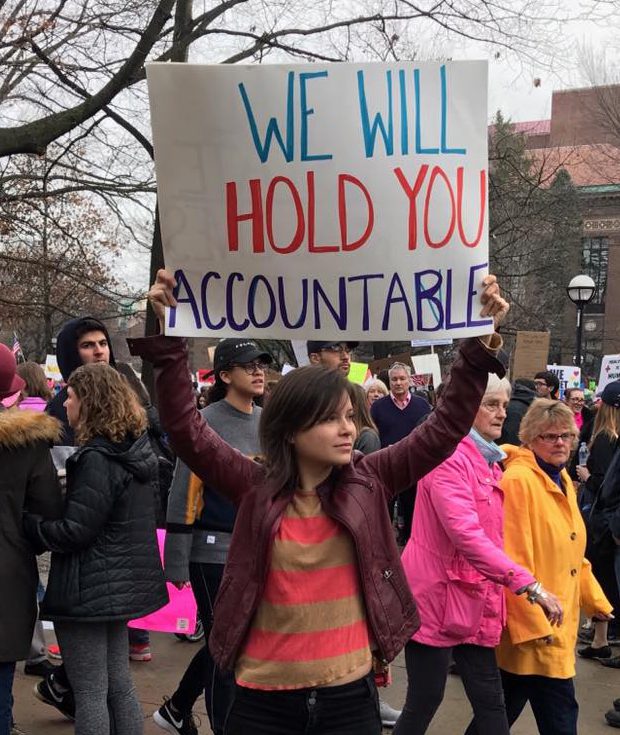 The sign I held at the women’s march was a message to president Trump saying: “we will hold you accountable.” Today, I want to make it clear that message is not just for the President, it’s for anyone who tries to violate me.